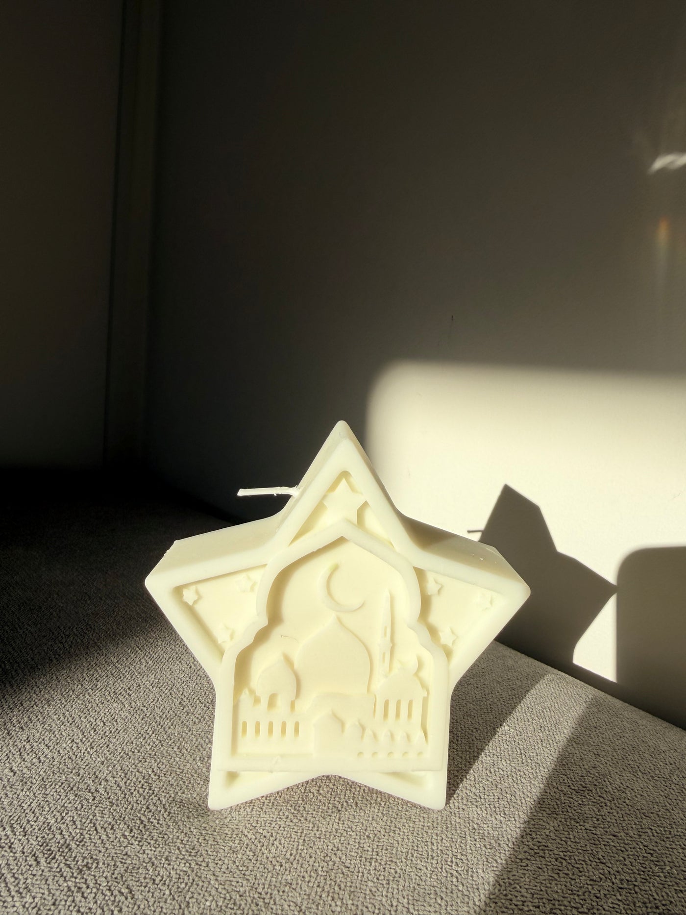 Cette bougie en forme d’étoile met en scène une mosquée délicatement sculptée, surmontée d’un croissant de lune. Elle évoque les nuits paisibles du mois de Ramadan, la lumière dans l’obscurité et les moments de recueillement partagés.